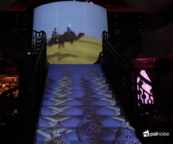 Los contenidos visuales creados desde nuestro estudio en Ibiza fueron supervisados por un experto en cultura islámica. Haciendo alusión a valores del corán y a iconos tradicionales de la cultura árabe proyectamos halcones, caballos, camellos, bereberes, naturaleza desértica, constelaciones, grafías y patrones de geometría arábicos.